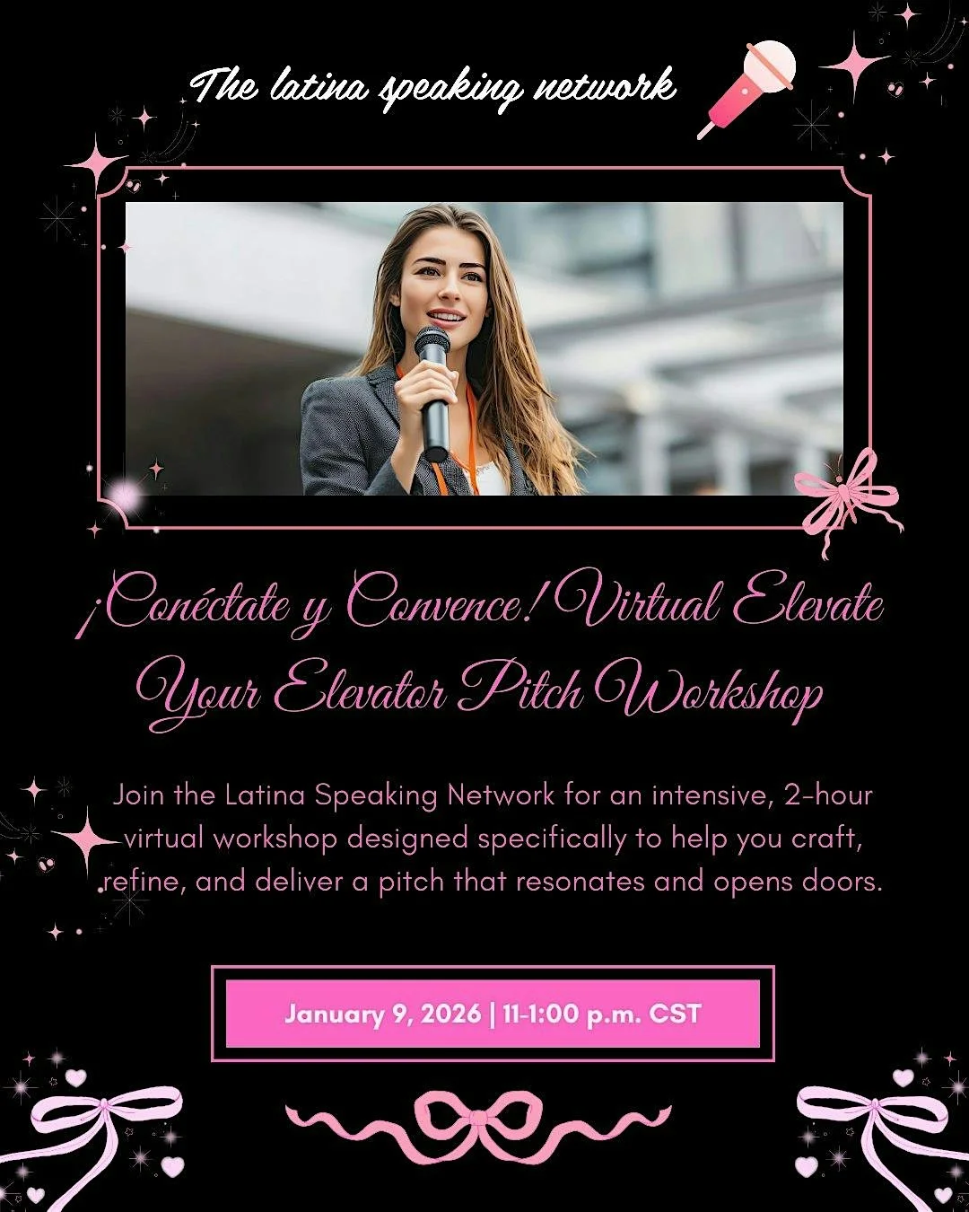 Join the Latina Speaking Network for an intensive, 2-hour virtual workshop designed specifically to help you craft, refine, and deliver a pitch that resonates and opens doors.